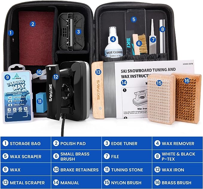 This comprehensive Snowboard Waxing Kit from Skifavs contains all the necessary tuning and waxing equipment for a professional wax job, including a wax iron, all temperature wax, edge tuner, brush, wax remover, wax scraper, metal scrape, P-tex, tuning stone and more. The kit is perfect for snowboard enthusiasts, providing everything you need for an expert-level wax job.
